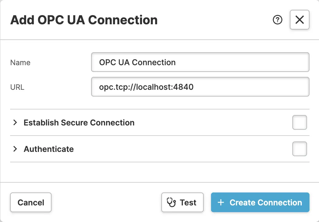 The OPC UA Connection is the most widespread of the options. See PLC Connection for more information about the different types.