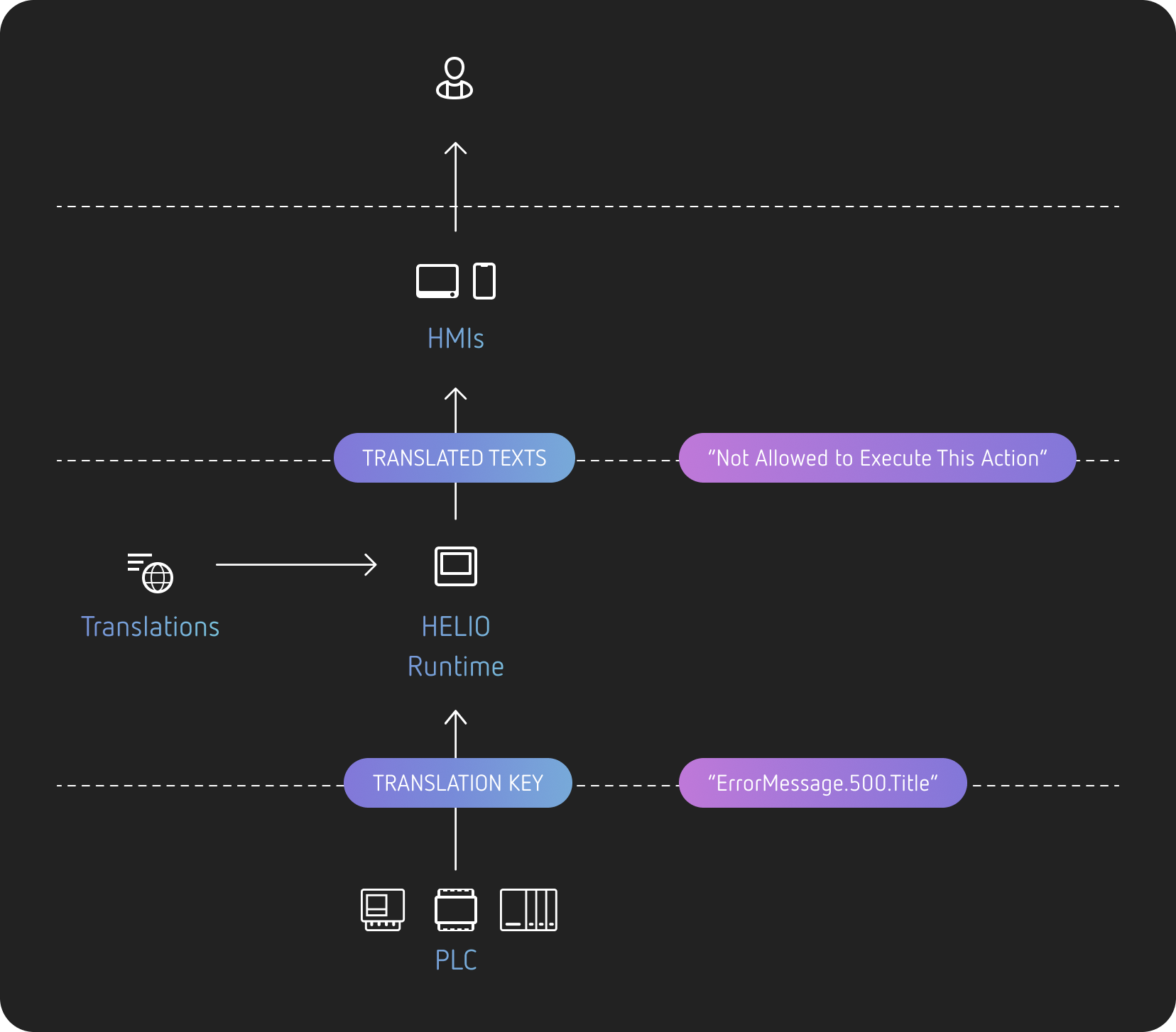 "ErrorMessage.500.Title", along with appropriate translations for each language. - You're done! HELIO will now ensure that the values provided by your PLC are displayed in the currently active language inside the HMI.