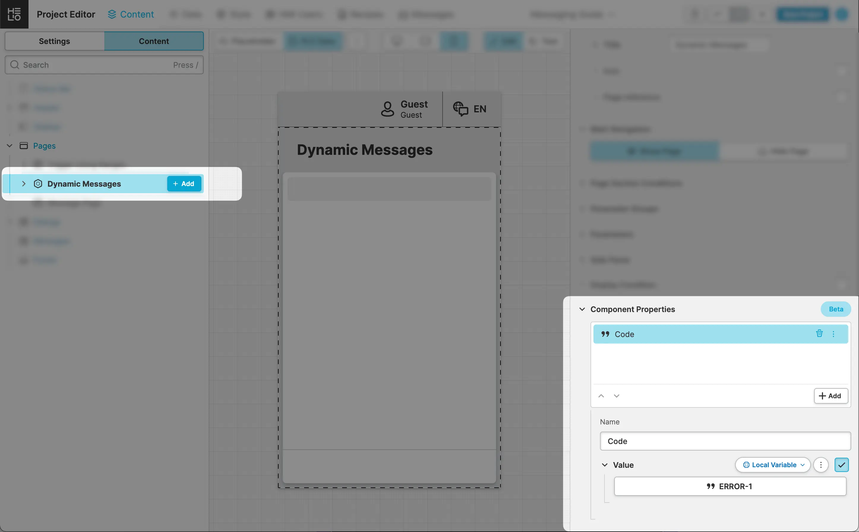 In order to be able to send multiple Message Codes, we first have to turn the page into a Component (see HELIO Components to learn more about Components).