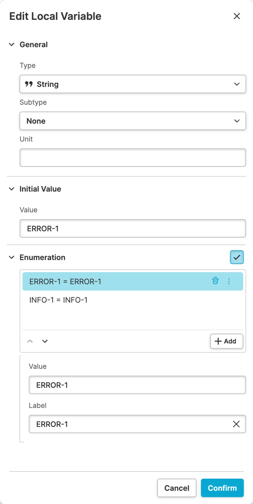 Define a Component Property named Message Code and add ERROR-1 and INFO-1 as possible values. This will allow