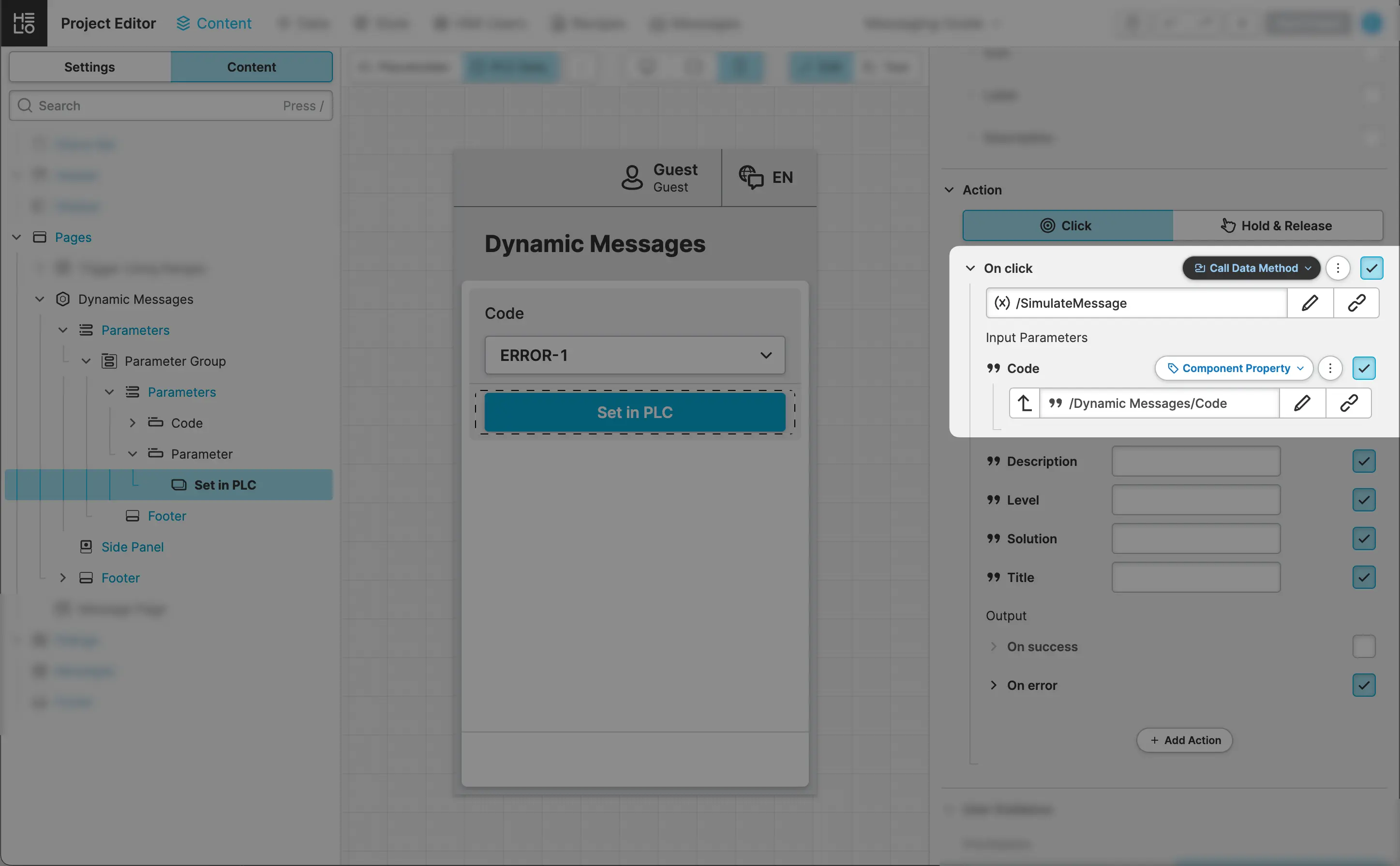Magic Inputto control the Message Code that shall get sent to the PLC and set its value property to the Component Property that we've just defined. - Add a