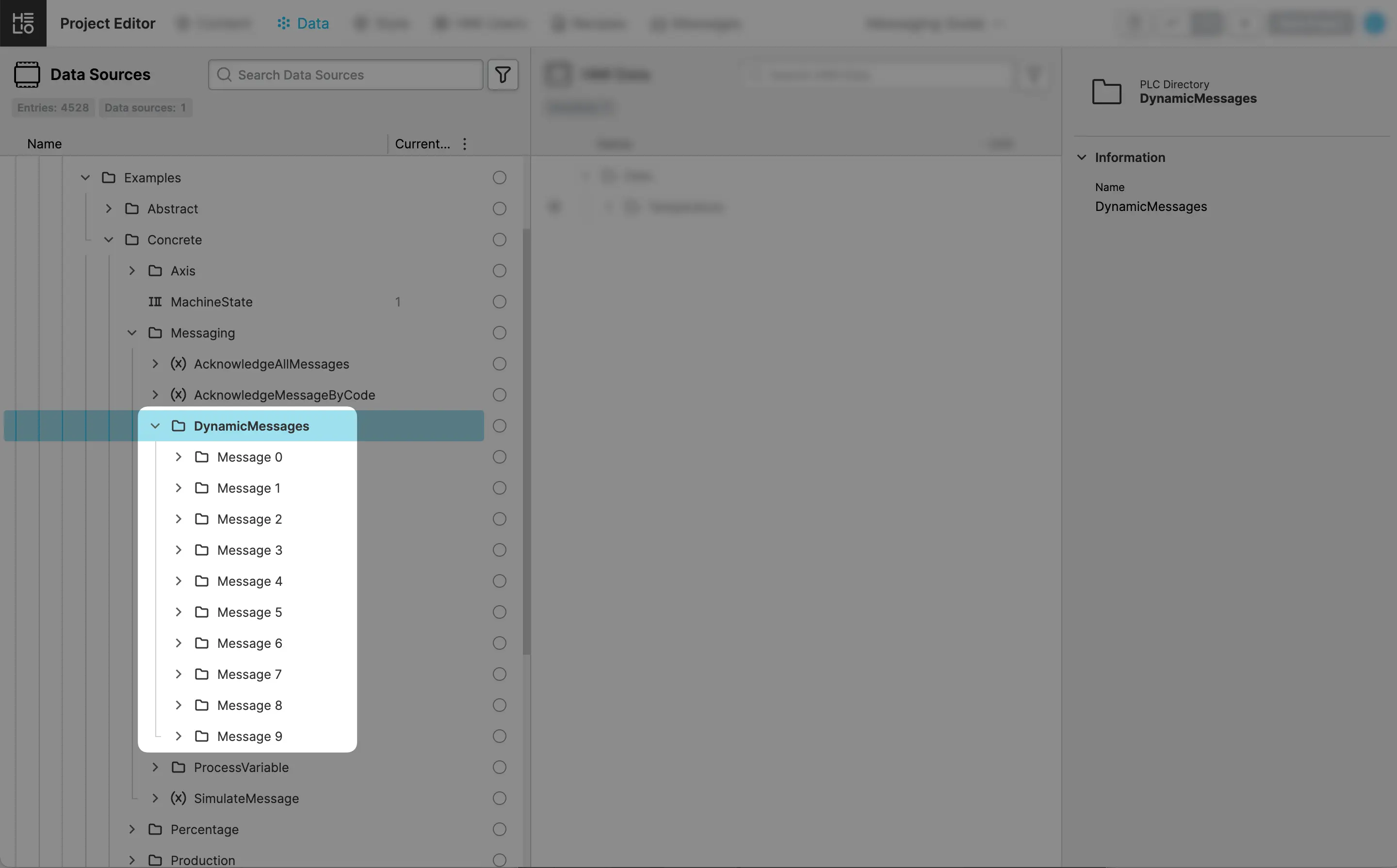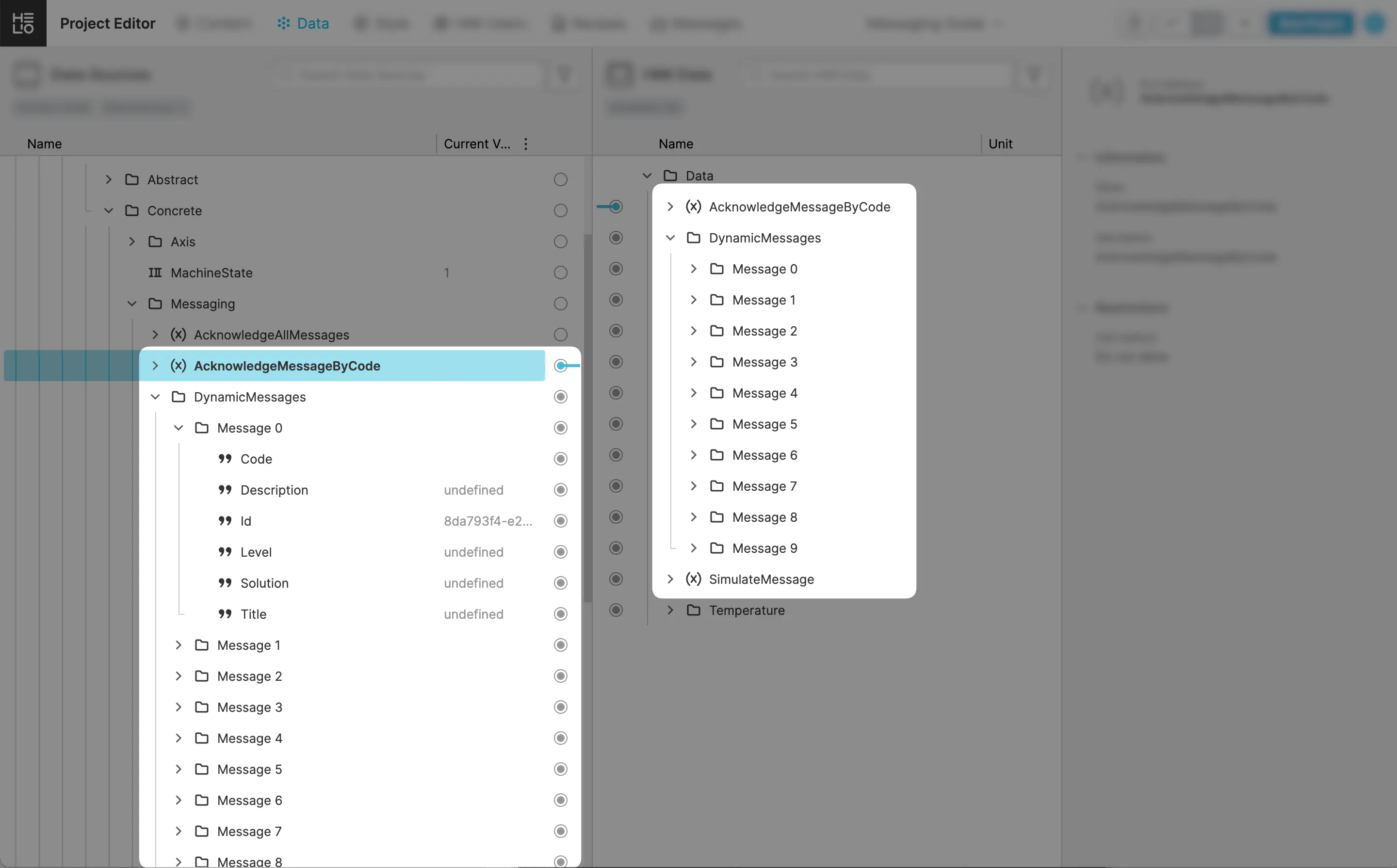 In previous HELIO versions (25.1 and below), structured objects could be represented as a data directory with message properties as child variables. This is still supported in HELIO 25.2.0 and later versions to support older project configurations without breaking existing projects. For newer projects, use the new Dynamic Message Triggers introduced in HELIO 25.2.0. They allow you to select a variable for each message property instead of specifying a property name, which is a bit more secure since HELIO can verify if this variable still exists.